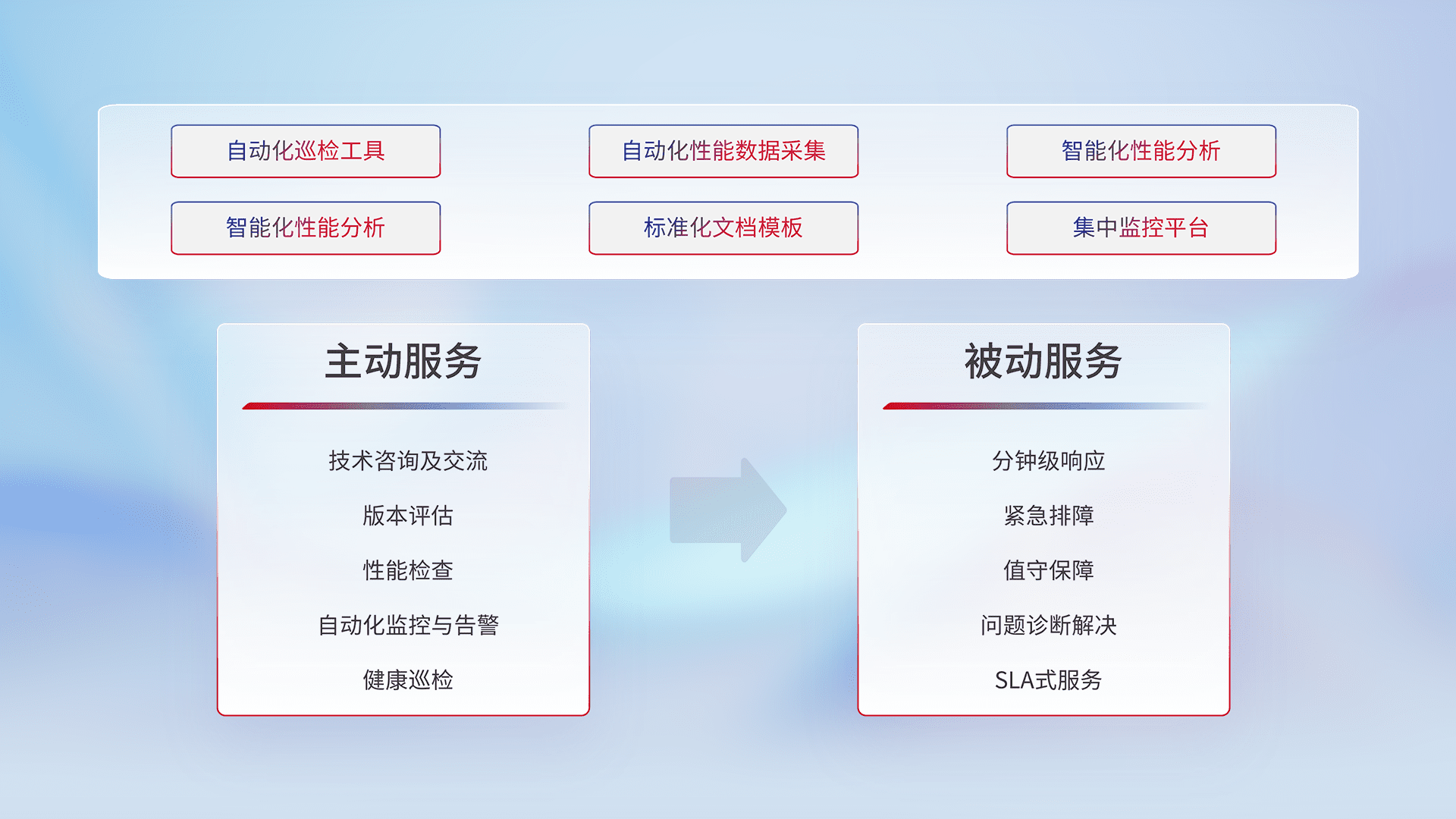智能化工具和标准化文档,,,保障服务质量,,提供主动服务(包含技术咨询、、、版本评估、、性能检查、、自动化监控与告警、、、健康巡检)和被动服务包含(分钟级响应、、紧急排障、、、、值守保障、、、、问题诊断解决、、、、SLA服务)。。。